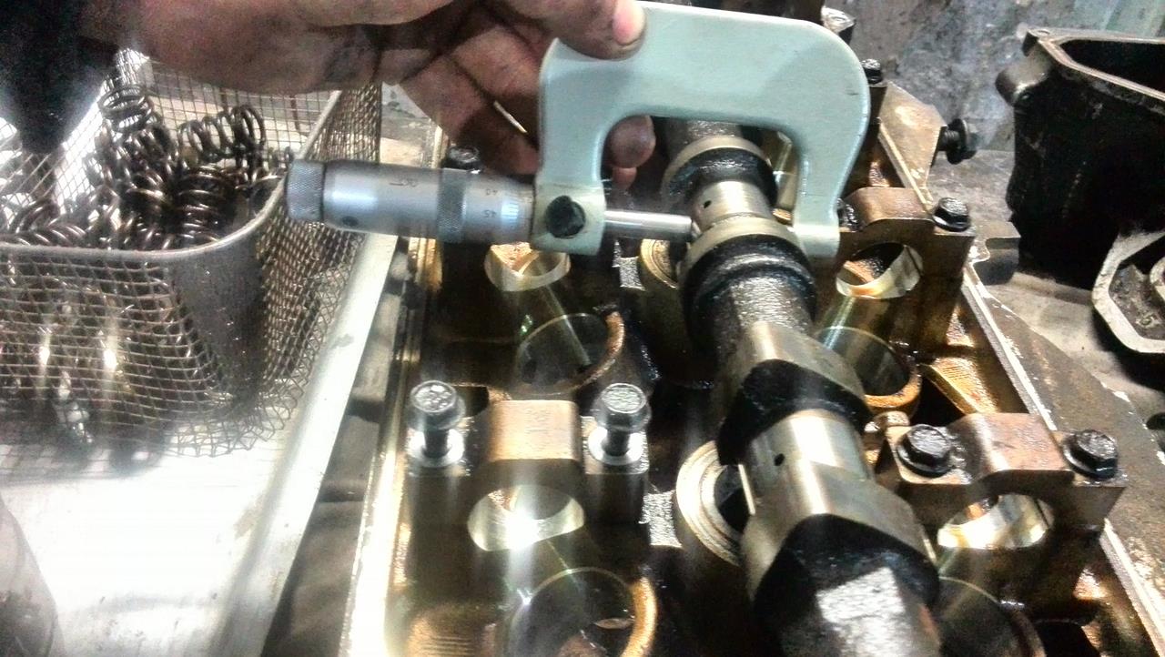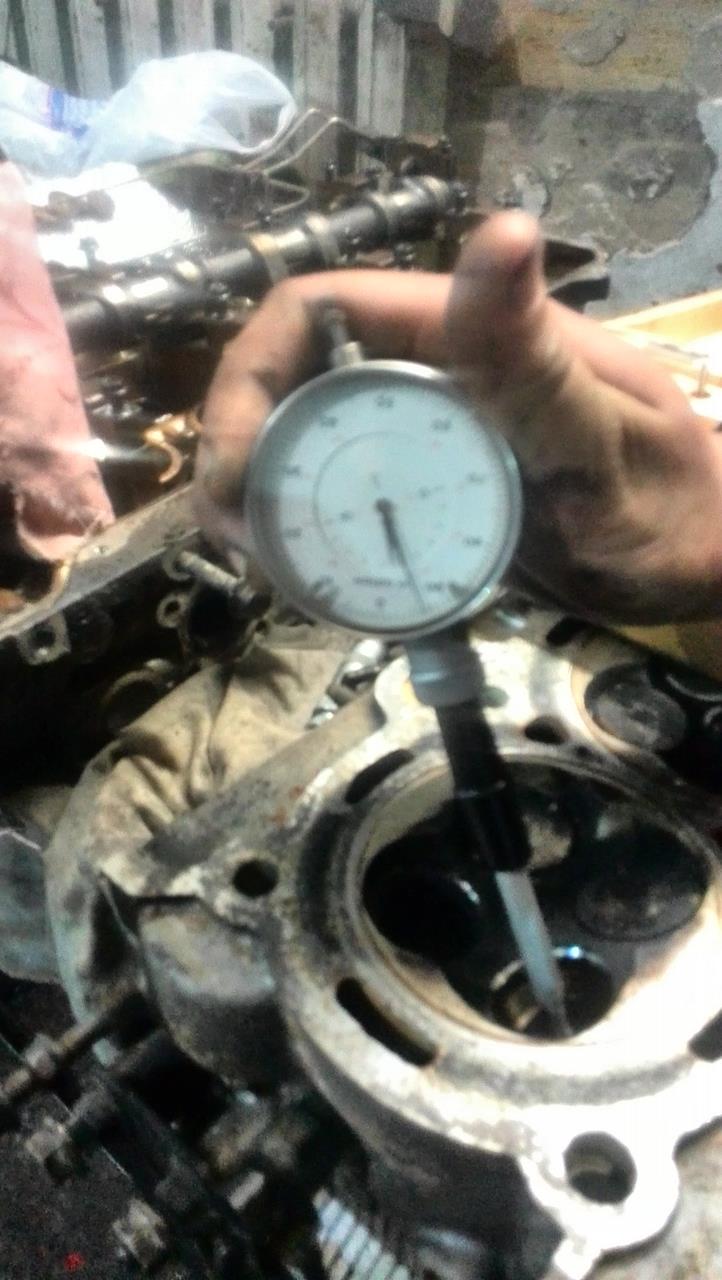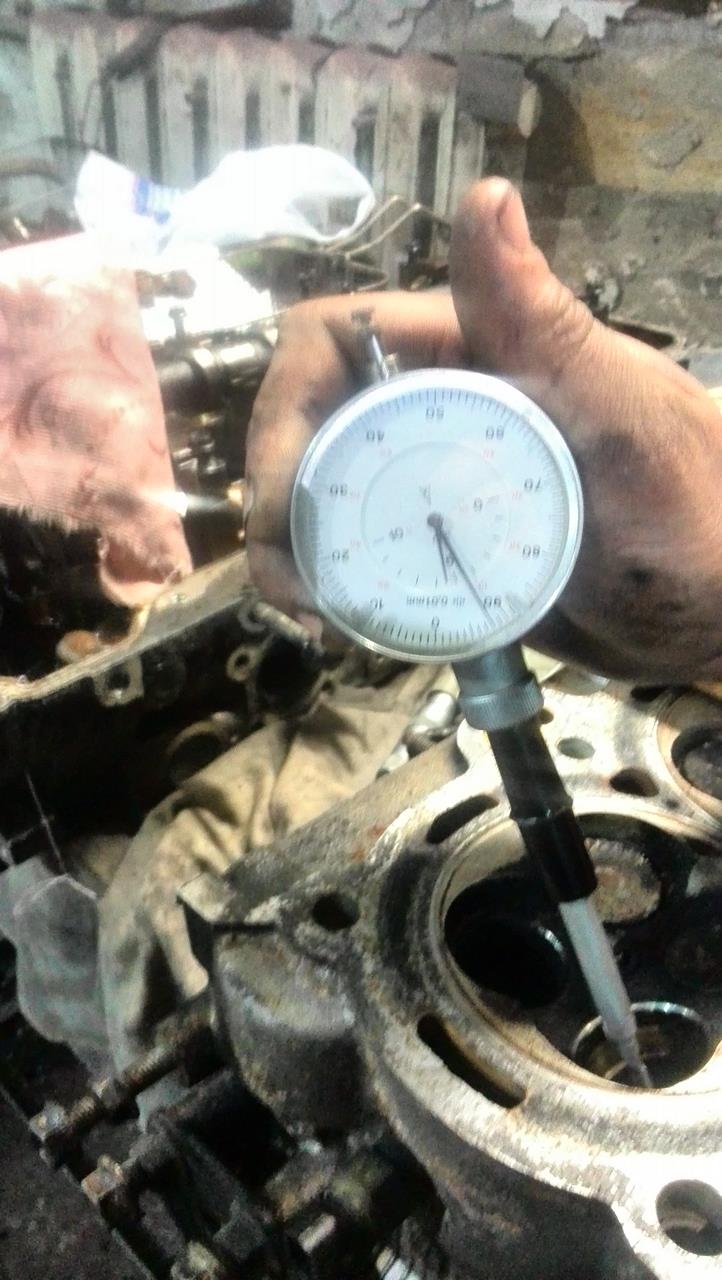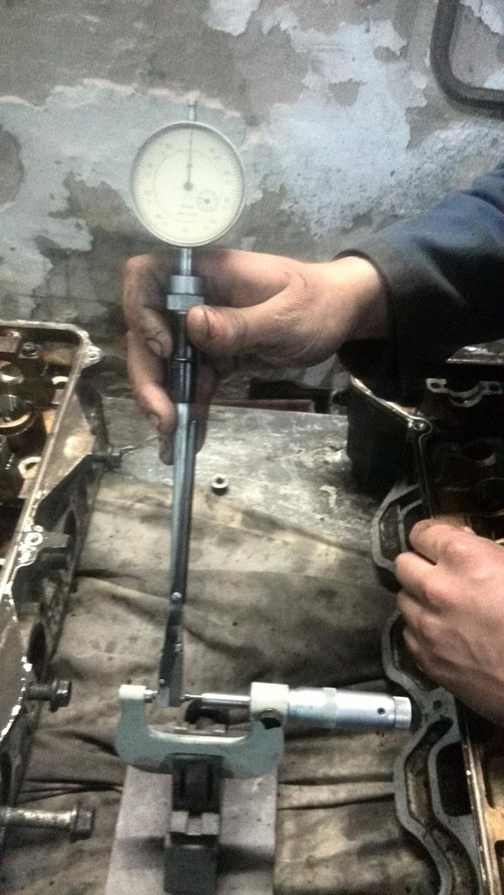 Окончательная разборка и замеры показали следующее - Головы. 1.Клапана в принципе по штокам не изношены,максимально обнаруженный конус 0.01 мм,но на выхлопных клапанах тарелки подрасклепаны,на фото не очень видно,но реально,после проточки фасок они сильно выйдут за допуск.Выхлопные я бы поменял. 2.Направляющие.Выхлопные с большим износом(конус к цилиндру),впускные 0.06-0.09 мм.В принципе,еще в допуске,но лучше конечно и впускные поменять. 3.Распредвалы. 26.95 мм - размер в норме,просто полирнуть. 4.Постели распредвалов изношены сильно.Размер пляшет от распредвалов 0.07 - 0.2 мм.Желательно в координатку. 5.Посадочные компенсаторов в норме,компенсаторы желательно поменять. Головы еще не опресовывал. Блок. 1.Поршневая показала 92.90 -92.92 мм.На 3 поршнях высыпало перегородки.Поршня под замену. 2.Цилиндры от поршня показали 0.12 - 0.22 мм с плавающей геометрией по цилиндру в разных плоскостях и высотах.Т.к. поршня по-любому менять,лучше сразу взять 0.25 или 0.5 и расточить. 3.Коленвал.Шатунные шейки 54.94 - 54.95 мм,коренные 64.34 - 64.35 мм.В норме,но большой прогиб по валу - 0.12 мм.Нужно править. 4.Постели коленвала.Негеометрия до 0.04- 0.06 мм(допуск до 0.02 мм),0.06 мм на центральной постели,рядом до 0.04 мм,на крайних в допуске. Постели коленвала надо делать. 5.Постели шатунов. 2 шатуна в допуске,2 на грани допуска и 4 за размером(негеометрия 0.03 - 0.04 мм.Допуск 0.016 мм).Нужно протачивать. 6.Маслонасос нужно или менять или делать в координатке.Шестерни в зацепе нормальные,а вот по плоскостям изношен.