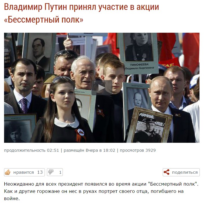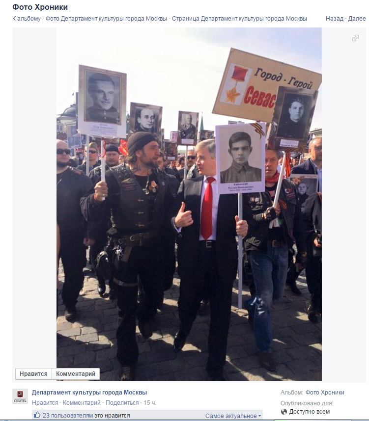 На официальной страничке Фейсбук Департамента культуры города Москва размещена фотография Министра Культуры Москвы, который идёт в колонне "Бессмертного полка", а в паре метров за ним кто–те несёт портрет Лаврентия Берии. Да, можно сказать, что Министр не обязан оглядываться назад и смотреть, кто там чьи портреты несёт. Тут вопрос в компетентности тех, кто эту фотографию выложил в Фейсбук, как доказательство участия Министра в этой акции. Неужели других снимков не нашлось? Или этот — самый удачный по той причине, что Министр идёт рука об руку с распиаренным главарём "Ночных волков"? Сомнительного качества пиар для главы Департамента Культуры на самом деле получился.